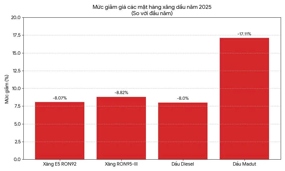 Trong năm 2025, giá xăng dầu trong nước đã được điều chỉnh 54 kỳ, với số lần tăng-giảm đan xen. Đến kỳ điều hành ngày 31/12/2025, giá các mặt hàng xăng dầu đều giảm từ 6% đến hơn 17% so với đầu năm; trong đó xăng E5 RON92 giảm 8,07%, xăng RON95-III giảm 8,82%, dầu diesel giảm 8%, dầu madut giảm sâu nhất 17,11%.