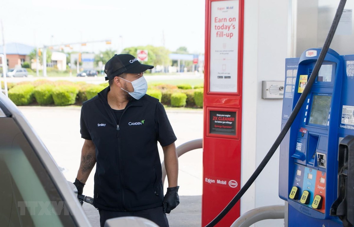 Nhân viên bơm xăng cho phương tiện tại một trạm xăng ở Plano, bang Texas, Mỹ ngày 20/4 vừa qua. (Ảnh: THX/TTXVN)