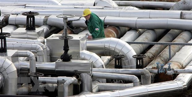 Công nhân kiểm tra tại một trạm tiếp nhận dầu trong hệ thống đường ống dẫn dầu Druzhba ở Szazhalombatta, cách Budapest, Hungary khoảng 30km về phía Nam. (Ảnh: AFP/TTXVN)