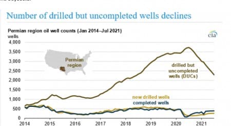 Theo Báo cáo năng suất khoan mới nhất của Cơ quan Thông tin Năng lượng Hoa Kỳ, nước này có 5.957 giếng khoan nhưng chưa hoàn thành (DUC) vào tháng 7 năm 2021, mức thấp nhất trong bất kỳ tháng nào kể từ tháng 11 năm 2017 từ mức gần 8.900 ở mức cao nhất năm 2019. Với tốc độ này, các nhà sản xuất đá phiến sẽ phải tăng mạnh việc khoan các giếng mới chỉ để duy trì quy trình sản xuất hiện tại.