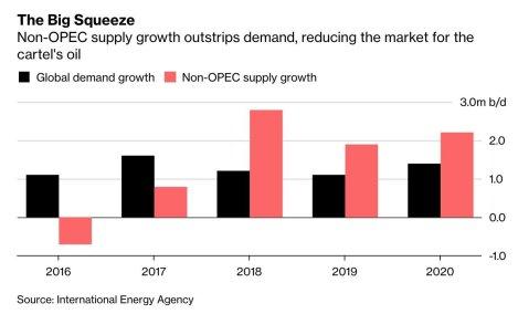 Ngay cả khi lạc quan cho rằng nền kinh tế toàn cầu mạnh lên thay vì suy yếu vào năm 2020, Cơ quan Năng lượng Quốc tế (IEA) dự báo rằng nhu cầu về dầu thô sẽ giảm năm thứ ba liên tiếp xuống còn 29,3 triệu thùng mỗi ngày. Đây là mức thấp hơn 650 nghìn thùng mỗi ngày so với 14 thành viên OPEC (sản xuất 40% nguồn cung trên thế giới) hiện đang bơm theo thỏa thuận cắt giảm sản lượng. Khi tăng trưởng toàn cầu trì trệ, áp lực phải từ bỏ các thỏa thuận hạn chế và tăng sản lượng/doanh số mạnh mẽ lên giữa các nhà sản xuất có nền kinh tế mới nổi đầy nợ nần và thiếu tiền mặt. Trong khi đó, nguồn cung cũng đang mở rộng ở những nơi như Bắc Mỹ, Na Uy và Brazil.