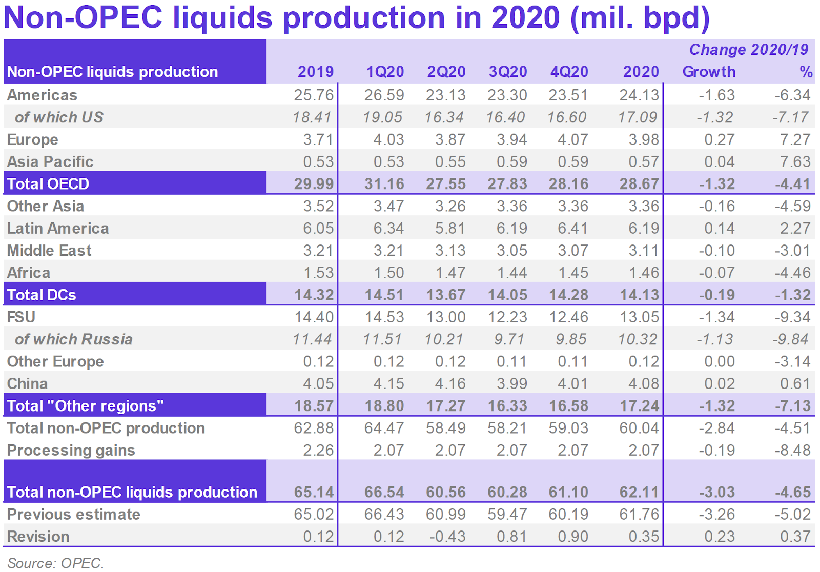 Biểu đồ dự báo sản lượng dầu của các nước ngoài OPEC năm 2020. (Nguồn: OPEC)