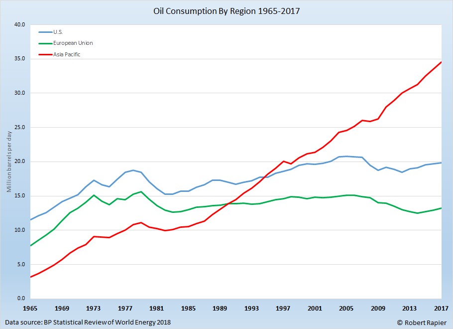 Nhưng nhu cầu ở khu vực Châu Á Thái Bình Dương đã tăng từ 9,1 triệu thùng/ngày vào năm 1973 lên 34,6 triệu thùng/ngày trong năm 2017. Mức tăng 280% trong nhu cầu này là nguyên nhân chính khiến đường cong nhu cầu thế giới tăng liên tục.