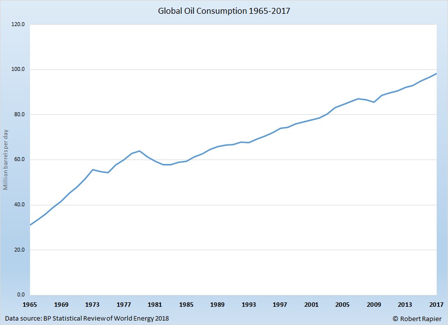 Tháng trước, Đánh giá thống kê Năng lượng Thế giới năm 2018 của BP về đã tiết lộ rằng sản xuất dầu toàn cầu hiện đã tăng trưởng trong tám năm liên tiếp. Tiêu thụ dầu cũng tăng lên mức cao mới, và đã tăng lên trong 31 trong số 34 năm qua.