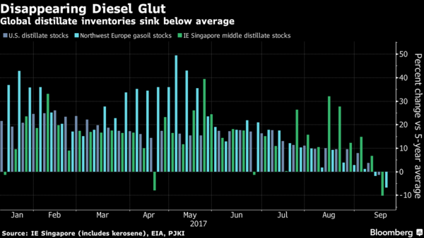 Sự kết hợp của nhu cầu tiêu thụ mạnh mẽ và sự gián đoạn sản xuất của các nhà máy lọc dầu đã giúp thu hẹp các kho dự trữ dầu diesel trên toàn cầu trong mùa hè, một sự kiện hiếm hoi vì hàng tồn kho này thường tăng lên từ tháng 7 đến tháng 9 để chuẩn bị cho nhu cầu tăng lên theo mùa với sự xuất hiện của mùa đông tại bắc bán cầu. Một đợt rét vào cuối năm nay hoặc vào đầu năm 2018 có thể thắt chặt thị trường hơn nữa, kích hoạt một đợt tăng giá nữa.