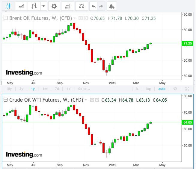 Giá dầu đang tăng, với dầu WTI đang ở trên $60/thùng và dầu Brent trên $70/thùng. Tổng thống Trump đã bày tỏ không mong muốn giá dầu tăng, nhưng rõ ràng là chính sách ông đưa ra lại đóng góp đáng kể đến đợt tăng giá này: sắc lệnh trừng phạt dầu từ Mỹ lên Iran và Venezuela đã cắt giảm đáng kể lượng dầu xuất khẩu trong tháng 2 và tháng 3.