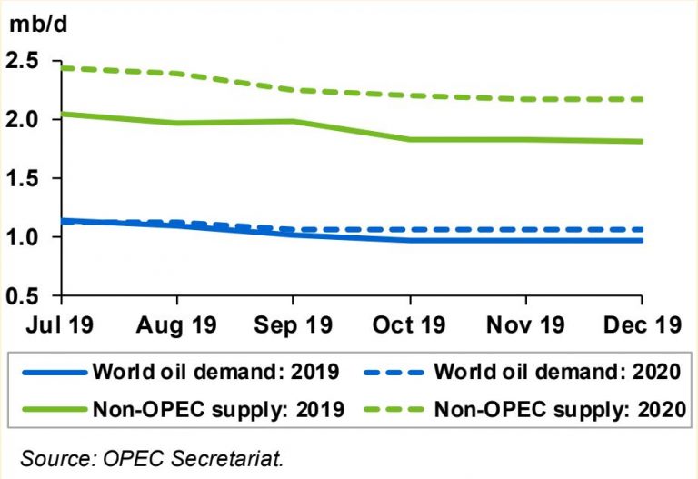 Về phía cung, tăng trưởng nguồn cung dầu ngoài OPEC trong năm 2019 thấp hơn so với kỳ vọng ban đầu của thị trường, hiện ở mức 1,82 triệu thùng/ngày so với dự báo ban đầu là 2,10 triệu thùng/ngày vào tháng 7 năm 2018. Tăng trưởng thấp hơn dự báo ở Canada, Brazil, Na Uy, Kazakhstan, Trung Quốc và Nga là những nước đóng góp chính cho việc điều chỉnh giảm, mặc dù hiệu suất nguồn cung của Mỹ tốt hơn mong đợi. Sản lượng dầu của Hoa Kỳ đang dẫn đầu mức tăng trưởng này với 1,62 triệu thùng/ngày trong năm 2019. Năm 2020, nguồn cung ngoài OPEC dự kiến sẽ tiếp tục giảm tốc độ tăng trưởng do hoạt động đầu tư giảm và hoạt động khoan dầu ít hơn ở Mỹ. Nguồn cung ngoài OPEC hiện được dự báo sẽ tăng 2,17 triệu thùng/ngày trong năm 2020, thể hiện sự điều chỉnh giảm khoảng 0,27 triệu thùng/ngày so với dự báo ban đầu vào tháng 7 năm 2019 do việc điều chỉnh giảm nguồn cung dầu của Hoa Kỳ. Tuy nhiên, Biểu đồ 2: Nhu cầu dầu thế giới và nguồn cung ngoài OPEC từ dự báo ban đầu vào năm 2019 và 2020 sản xuất gia tăng từ các lưu vực đá phiến, đặc biệt là ở Lưu vực Permian, cũng như từ các mỏ ngoài khơi ở Na Uy, Brazil, Úc và có thể là Guyana, sẽ đóng góp cho nguồn cung ngoài OPEC vào năm 2020.