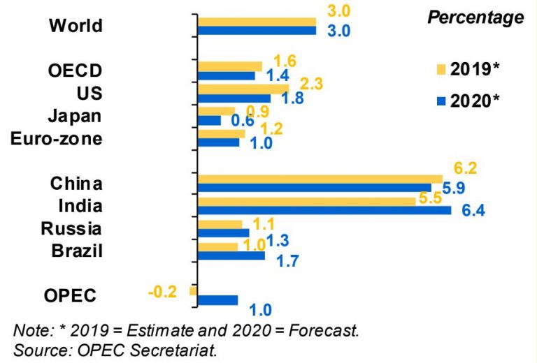 Tăng trưởng kinh tế toàn cầu đã chậm lại trong năm 2019, bị ảnh hưởng bởi một loạt các thách thức. Các vấn đề thương mại không chỉ dẫn đến sụt giảm tiêu dùng toàn cầu mà còn khiến tăng trưởng đầu tư giảm tốc. Về mặt tích cực, suy thoái thương mại toàn cầu có thể đã chạm đáy, và bây giờ xu hướng tiêu cực trong sản xuất công nghiệp được nhìn thấy vào năm 2019 dự kiến sẽ đảo ngược vào năm 2020. Do đó, tăng trưởng kinh tế toàn cầu được dự báo ở mức 3.0% cho cả năm 2019 và 2020.