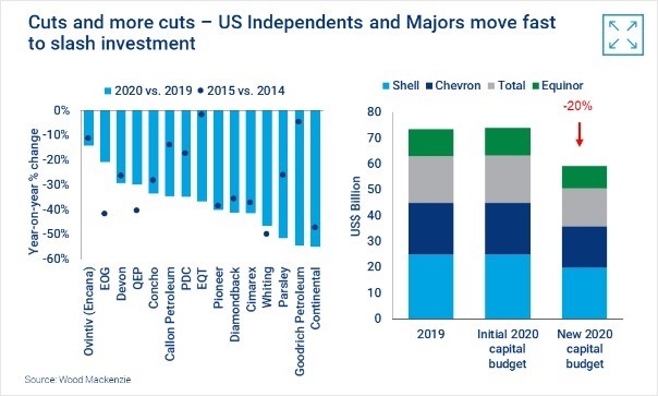 2. Thứ hai, cắt giảm chi tiêu và cắt giảm trong thời gian dài gấp đôi. Rút kinh nghiệm từ lần sụt giảm giá dầu 2014-2016, các công ty thượng nguồn đã xử lý nhanh chóng để gửi thông điệp tới các nhà đầu tư và người cho vay rằng họ buộc phải thực hiện để bảo vệ lợi ích của các cổ đông và ngân hàng. Hơn 48 doanh nghiệp hoạt động thượng nguồn tại Mỹ đã giảm áp lực tạora dòng tiền trước khi giá dầu giảm sâu. Hai tuần sau đó, 22 nhà sản xuất dầu khí độc lập thông báo cắt giảm đầu tư trong năm 2020 với tổng số hơn 20 tỷ USD, tỷ lệ giảm trung bình từ 35-50% trở lên.
