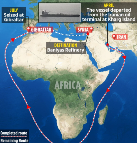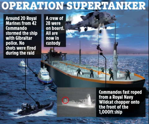 Lực lượng thủy quân lục chiến Hoàng gia Anh ngày 4/7 bắt giữ tàu chở dầu Grace 1 xuất phát từ Iran do nghi ngờ tàu này vận chuyển dầu tới Syria, vi phạm các lệnh trừng phạt của EU. Theo báo chí Iran, vụ bắt giữ được hải quân Anh thực hiện theo yêu cầu từ phía Mỹ.