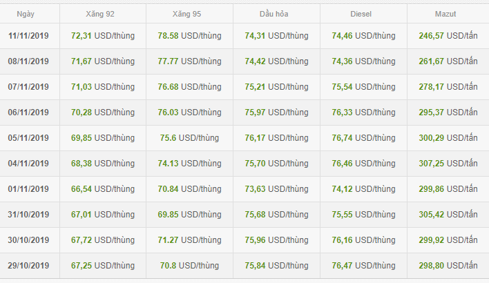 Theo dữ liệu được cập nhật từ Bộ Công Thương, giá xăng thành phẩm bình quân trên thị trường Singapore chu kỳ này với RON 92 là 70 USD một thùng và RON 95 là 75,6 USD một thùng, tăng 2-3% so với chu kỳ trước. Ngược với giá xăng, giá dầu giảm 2%, còn 75 USD một thùng. Do đó kỳ điều hành diễn ra chiều nay (15/11), nếu không trích hoặc sử dụng quỹ thì giá xăng có thể sẽ tăng 200 - 400 đồng một lít, riêng với giá dầu giảm 200 - 300 đồng.