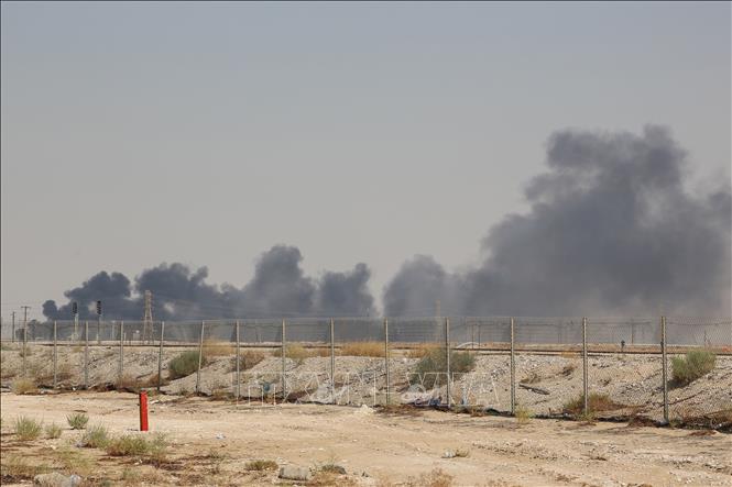 Khói bốc lên từ nhà máy lọc dầu Aramco ở Abqaiq, miền Đông Saudi Arabia sau vụ tấn công ngày 14/9/2019. Ảnh: AFP/TTXVN