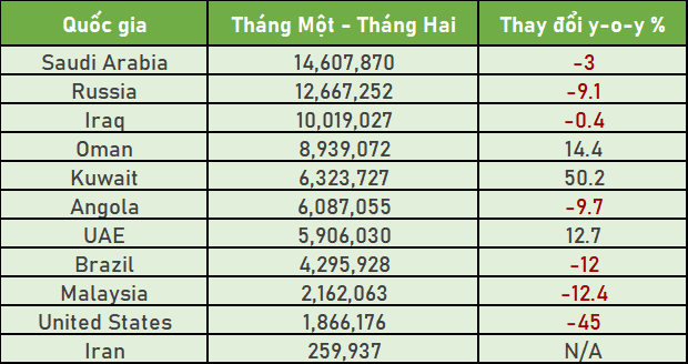 Dữ liệu từ Tổng cục Hải quan hôm Chủ nhật cho thấy lượng dầu thô của Saudi Arabia đến trong tháng Một - tháng Hai đạt 14,61 triệu tấn, tương đương 1,81 triệu thùng/ngày, so với 1,86 triệu thùng/ngày cùng kỳ một năm trước đó.