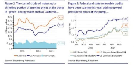 Có lẽ quan trọng hơn, sự tin tưởng năng lượng tái tạo đã khiến các nhà máy lọc dầu của Mỹ phải đóng cửa cơ sở dầu thô để chuyển sang sản xuất nhiên liệu tái tạo. Do đó, Hoa Kỳ có công suất lọc dầu kém hơn so với trước đại dịch, nhưng các cơ sở tái tạo vẫn đang được xây dựng. Do đó, các sản phẩm tinh chế đang gặp phải tình trạng khan hiếm nguồn cung và áp lực tăng giá.