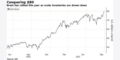 Giá dầu Brent đạt mức cao nhất trong ba năm ở mức 80 USD/thùng vào đầu ngày thứ Ba, được thúc đẩy bởi nhu cầu phục hồi và cuộc khủng hoảng nguồn cung năng lượng toàn cầu làm tăng việc sử..