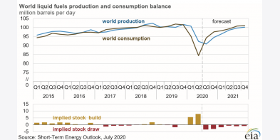 EIA tăng dự báo giá dầu bình quân năm 2020 thêm 6,5% lên 40,5 USD/thùng, năm 2021 đạt 49,7 USD/thùng. Nguồn cung thế giới 94,59 triệu bpd, nhu cầu tiêu thụ 92,89 triệu bpd, dư thừa ở mức 1,7..