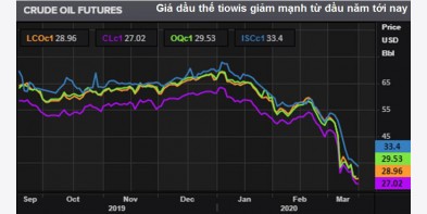 Giá dầu ngọt nhẹ Mỹ giao tháng 4 tại thị trường New York giảm 3,03 USD xuống còn 28,70 USD/thùng trong khi giá dầu Brent giao tháng 5/2020 tại thị trường London (Anh) giảm 3,80 USD xuống 30,05 USD. Quang c..