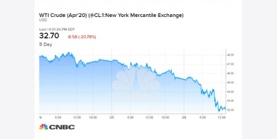 Giá dầu giảm khoảng 1/3 trị giá trong ngày 9/3, ngày giảm giá lớn nhất kể từ cuộc chiến vùng Vịnh năm 1991, do Saudi Arabia và Nga báo hiệu họ sẽ tăng sản lượng trong thị trường dầu vốn đã..