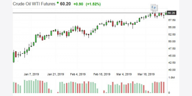 Trong 3 tháng đầu năm 2019, giá dầu WTI tăng đến 32,4% và như vậy có quý tăng cao nhất tính từ quý 2/2009. Ảnh: MarketWatch Phiên giao dịch đầu ti&eci..