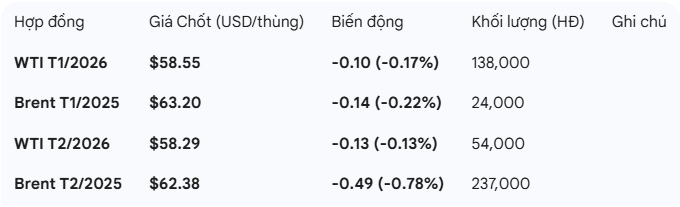 Tâm lý Thị trường Yếu, Thanh khoản Thấp: Tháng 11 đánh dấu tháng giảm giá thứ tư liên tiếp của cả Brent và WTI. Khảo sát của Reuters với 35 chuyên gia dự báo giá Brent trung bình năm 2026 chỉ khoảng 62.23 USD/thùng, thấp hơn đáng kể so với mức trung bình hiện tại của năm 2025.