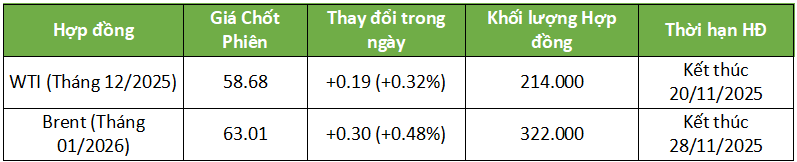 Lưu ý: Giá có sự khác biệt nhỏ giữa các hợp đồng tháng (WTI HĐ Tháng 01/2026 chốt ở 58.63; Brent HĐ Tháng 02/2026 chốt ở 62.64).