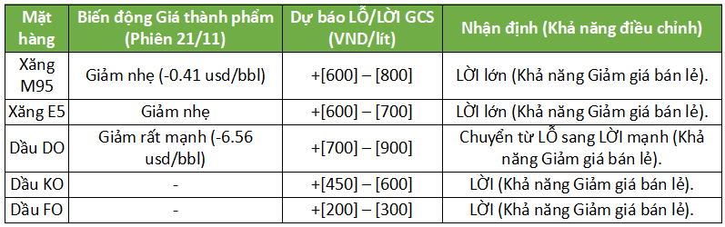 Tình hình chung: Cả xăng và Dầu DO đều đang ở mức LỜI GCS cao. Dự báo chung là giá bán lẻ xăng và Dầu DO sẽ đồng loạt giảm mạnh vào kỳ điều chỉnh ngày 27/11/2025.