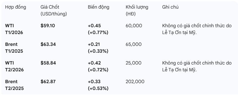 Giá dầu thô tăng nhẹ trong phiên Thứ Năm (27/11) khi thị trường tiếp tục dao động giữa các yếu tố địa chính trị, chính sách tiền tệ và tâm lý nghỉ lễ: