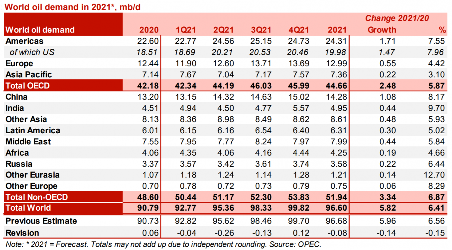 OPEC trong báo cáo thị trường tháng 10 (MOMR) cắt giảm triển vọng nhu cầu dầu thô thế giới năm 2021 từ 5,96 triệu bpd xuống còn 5,82 triệu bpd bất chấp những giả định tích cực về nhu cầu dầu trong quý IV, được hỗ trợ bởi lĩnh vực hóa dầu, nhu cầu nhiên liệu sưởi ấm và nhu cầu tiềm năng chuyển đổi từ khí đốt sang dầu mỏ trong lĩnh vực phát điện. Số liệu cho thấy, nhu cầu tiêu thụ thực tế đã thấp hơn trong quý II và III. Dự báo tăng trưởng nhu cầu dầu thế giới năm 2022 không thay đổi ở mức 4,2 triệu bpd lên 100,8 triệu bpd.
