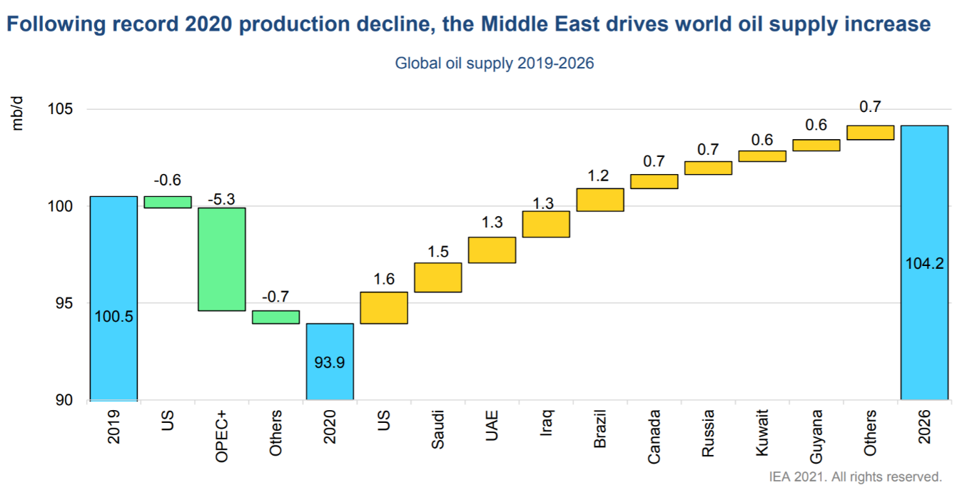 Biểu đồ trên cho thấy, sau khi sản lượng dầu bị suy giảm kỷ lục trong năm 2020, sản xuất dầu của các nước Mỹ, Ả rập Saudi, UAE, I-raq, Brazil, Nga,…đều đang tăng.