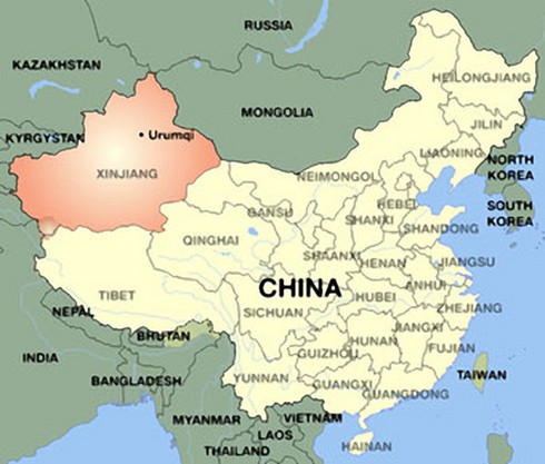 Vị trí Khu tự trị Tân Cương (màu hồng cam) trên bản đồ Trung Quốc.