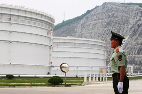 Nhân viên an ninh đứng canh gác ở các bồn dầu khổng lồ ở Căn cứ dự trữ dầu quốc gia ở Chiết Giang, Trung Quốc. Ảnh: Getty