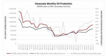 Một chỉ báo quan trọng cho thấy sản lượng dầu của Venezuela đang đạt công suất tối đa và có thể thấp hơn đáng kể so với báo cáo của PDVSA là sự chênh lệch lớn giữa khối lượng sản xuất từ thông tin trực tiếp và khối lượng do OPEC ghi nhận được từ các nguồn thứ cấp. Dữ liệu từ các nguồn thứ cấp cho thấy Venezuela chỉ bơm 681.000 thùng mỗi ngày trong tháng 12 năm 2021, thấp hơn 190.000 thùng, tức là thấp hơn 22% so với con số do PDVSA cung cấp. Đây là chủ đề phổ biến khi xem xét dữ liệu sản lượng của thành viên do OPEC công bố trong Báo cáo thị trường dầu hàng tháng của tổ chức này. Biểu đồ dưới đây cho thấy sự khác biệt lớn giữa khối lượng sản xuất do PDVSA cung cấp và khối lượng được báo cáo lên OPEC từ các nguồn thứ cấp.