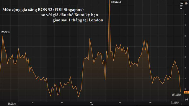 Giá xăng tại Singapore cũng giảm mạnh trong mấy tuần qua. Từ trên 19 USD/thùng ngày 5/9/2018, mức cộng giá xăng (hợp đồng tham chiếu) tại Singapore (so với hợp đồng dầu Brent tham chiếu tại London) đã giảm xuống chỉ còn 10,69 USD/thùng hiện tại. So với thời điểm đầu tháng 5/2018, mức cộng này cũng đã giảm trên 17%.