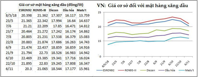 Tại Việt Nam, biên độ dao động giá xăng dầu từ tháng 5/2018 tới nay vào khoảng 1.500 đồng/lít, thấp hơn nhiều so với mức độ dao động giá xăng dầu thế giới. Trong đó thời điểm giá cao nhất rơi vào nửa đầu tháng 10/2018 (trùng thời điểm giá dầu WTI và Brent cao đỉnh điểm của năm nay) nhưng chậm hơn khoảng 1 tháng so với thị trường Singapore. Hiện tại, giá cơ sở mặt hàng xăng dầu do liên Bộ Tài chính và Công Thương đưa ra, các mặt hàng xăng E5 RON92 và Ron95-III tương đương mức giá đầu tháng 5/2018, nhưng giá diezen, dầu hỏa và dầu madút đều vẫn cao hơn trên 1.000 đồng/lít so với cách đây 6 tháng. Tổng thể, giá xăng dầu Việt Nam giảm chậm hơn rất nhiều so với giá quốc tế.